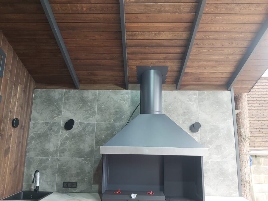 • Дымосборник он же вытяжной зонт может быть выполнен как с одним выходом для дымохода, так и  разделить на два канала. Зонт съемный, крепится к каркасу при помощи болтового соединения