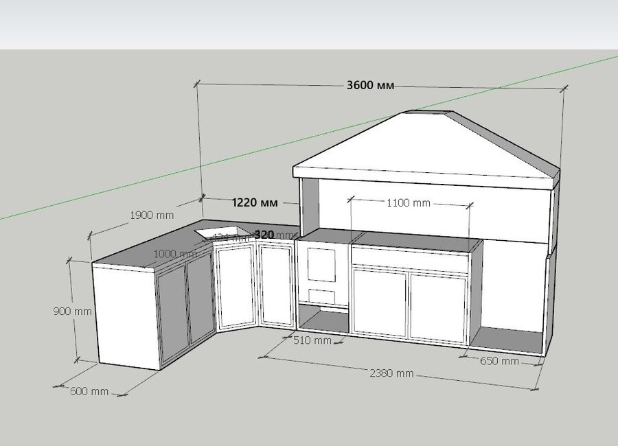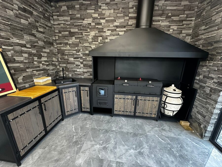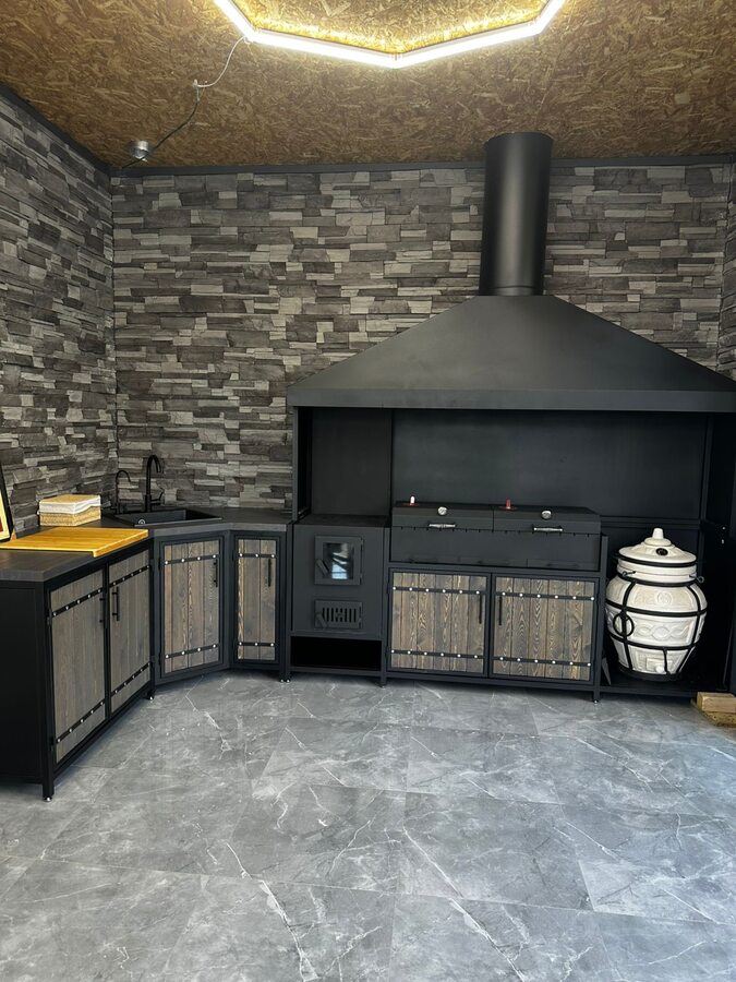 - Конструкция модульная, варианты расположения узлов может быть любым, к примеру печка с права, или мангал сместить на другую сторону……