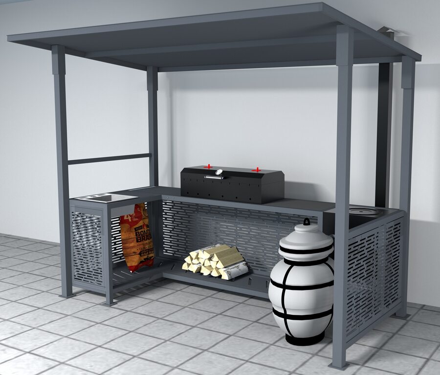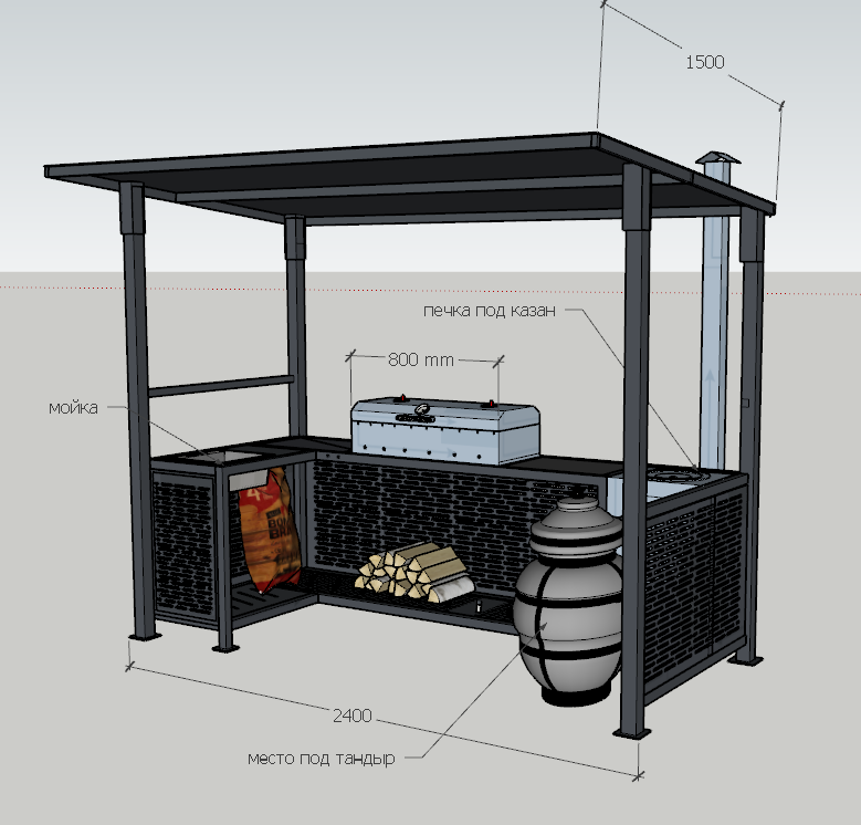 Комплектация: | Каркас с крышей, мангал, печка, дымоход, совок, кочерга и подвес для казана |