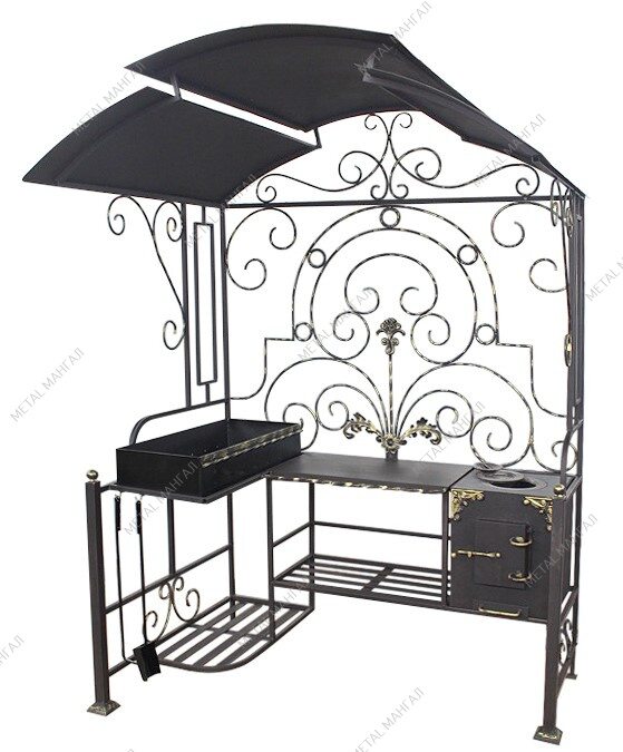 Кованый мангал с крышей “Меркурий”. Цельная металлическая конструкция из стального листа, металлопрофиля и стального прута. Украшен коваными элементами. Двухскатная крыша из стали с отверстиями для дыма. Топка и печка съемные. Столешница Д х Ш(68 х 41)см. Нижняя полка для посуды и дровница для топлива.