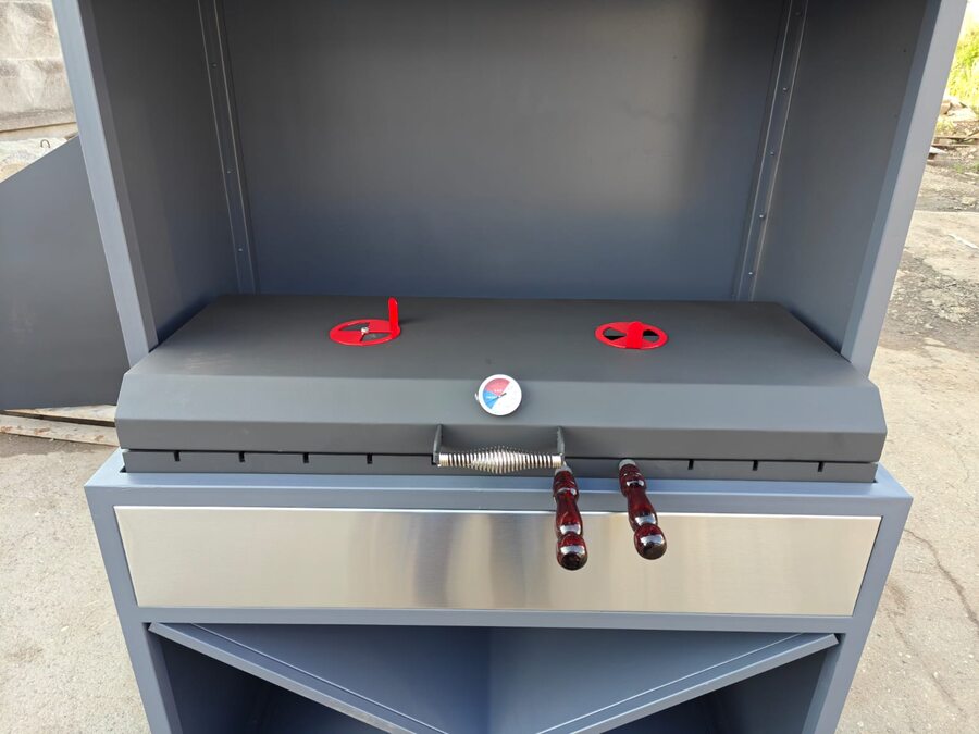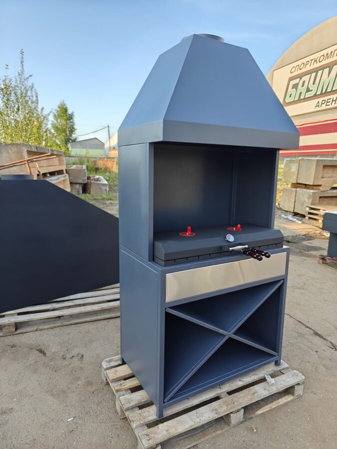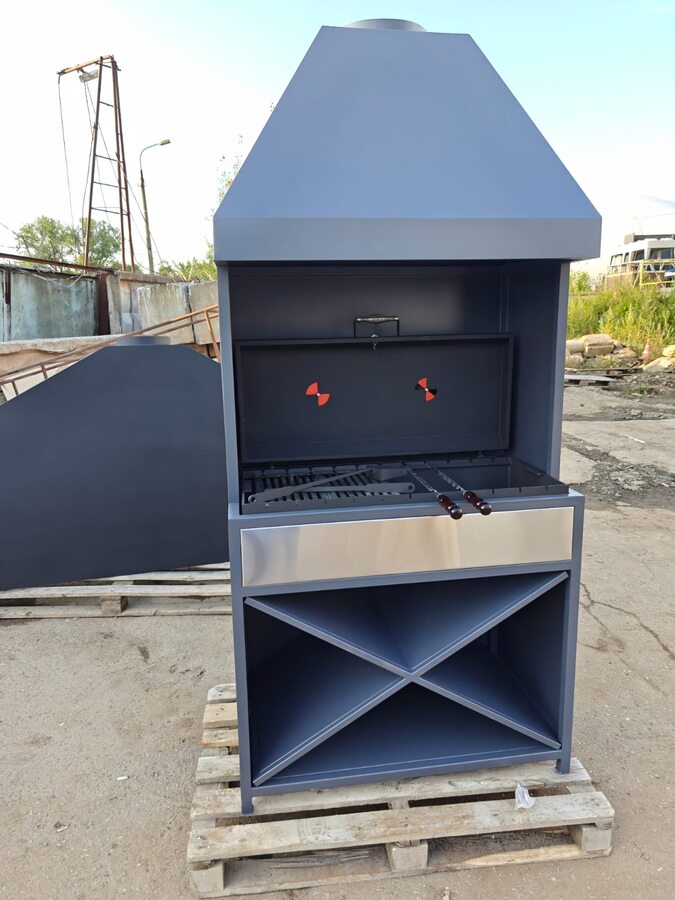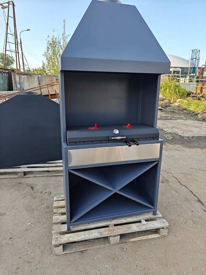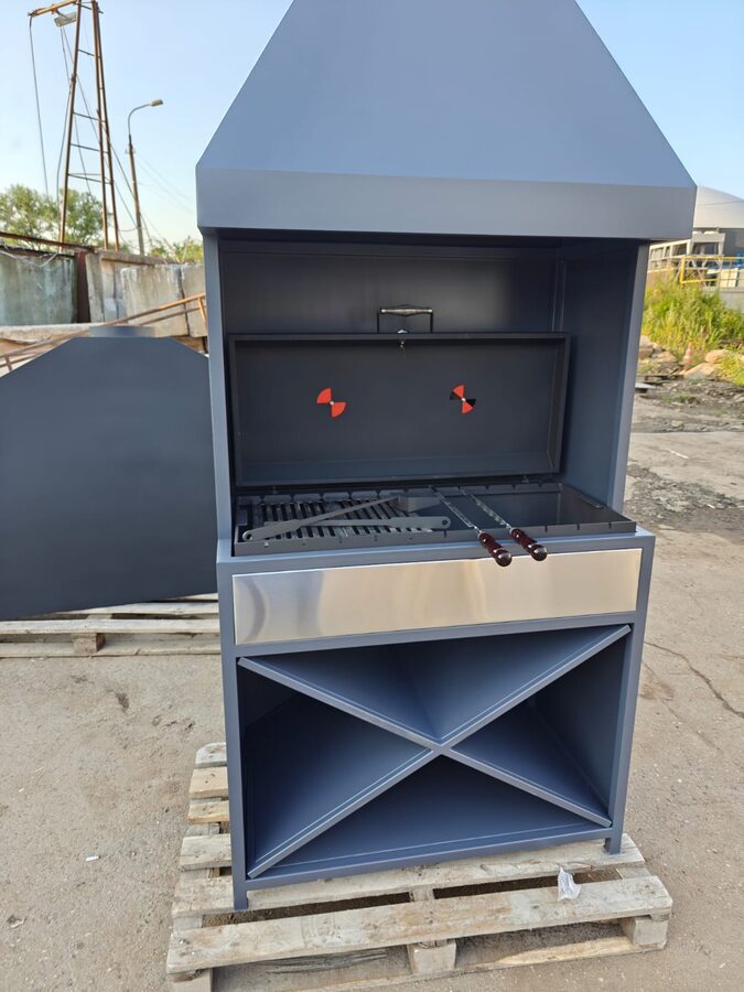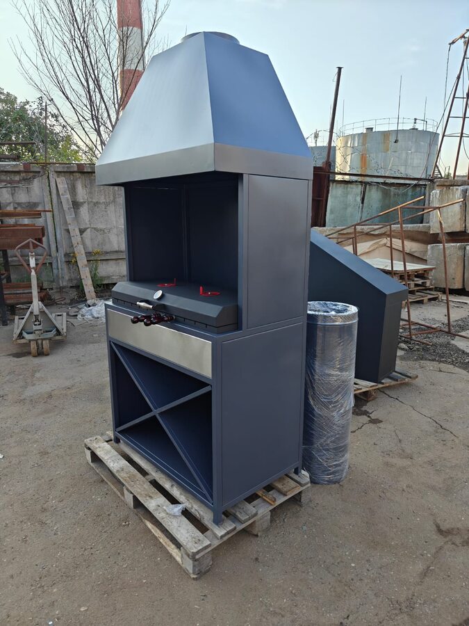 Металлический закрытый мангал с вытяжным зонтом предназначен для установки в любом помещении, терраса, деревянная беседка или же просто под навесом. Цельная металлическая конструкция из стального листа и металлопрофиля надежно защищает от попадания искр за пределы мангальной зоны.